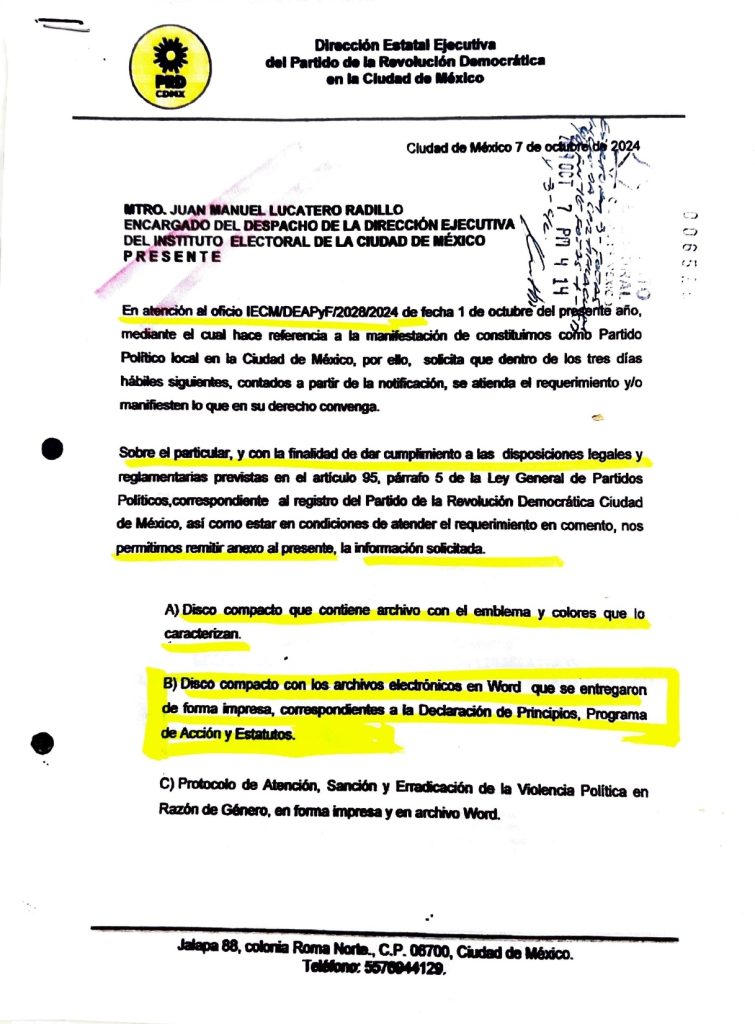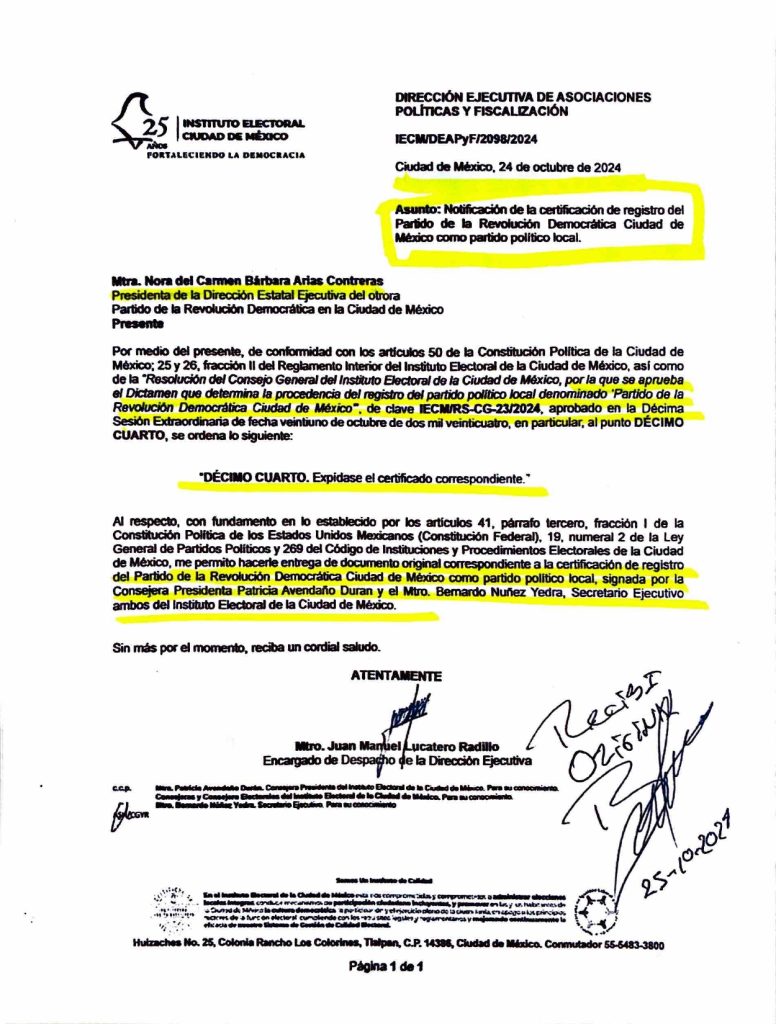 Como parte de los trámites, el 7 de octubre de 2024, en tiempo y forma, Nora Arias cumplió todos los requisitos solicitados por el IECM, llamados “documentos básicos”, y por ello es que le concedieron el registro como partido político local. De ello fue notificada mediante el oficio IECM/DEAPyF/2098/2024, fechado el 24 de octubre, dirigido a: “Mtra. Nora del Carmen Bárbara Arias Contreras, Presidenta de la Dirección Estatal Ejecutiva del otrora Partido de la Revolución Democrática en la Ciudad de México”. El dictamen “determina la procedencia del registro del partido político local denominado Partido de la Revolución Democrática Ciudad de México, de clave IECM/RS-CG-23/2024, aprobado en la Décima Sesión Extraordinaria de fecha veintiuno de octubre de dos mil veinticuatro, en particular, al punto DÉCIMO CUARTO”.