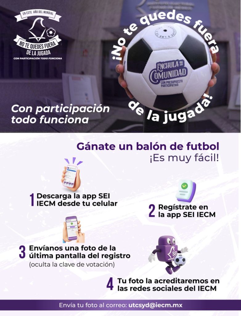 En la ola mundialista, se les ocurrió la sesuda idea de regalar balones a cambio del voto en la modalidad virtual, que tendrá que efectuarse entre el 29 de abril y 2 de mayo, previo registro, en el cual precisamente es donde incurren en la presunta ilegalidad. Han invitado a participar en el proceso de votación y ofrecen como dádiva un “balón (de futbol) conmemorativo de ‘Enchula tu comunidad’”.